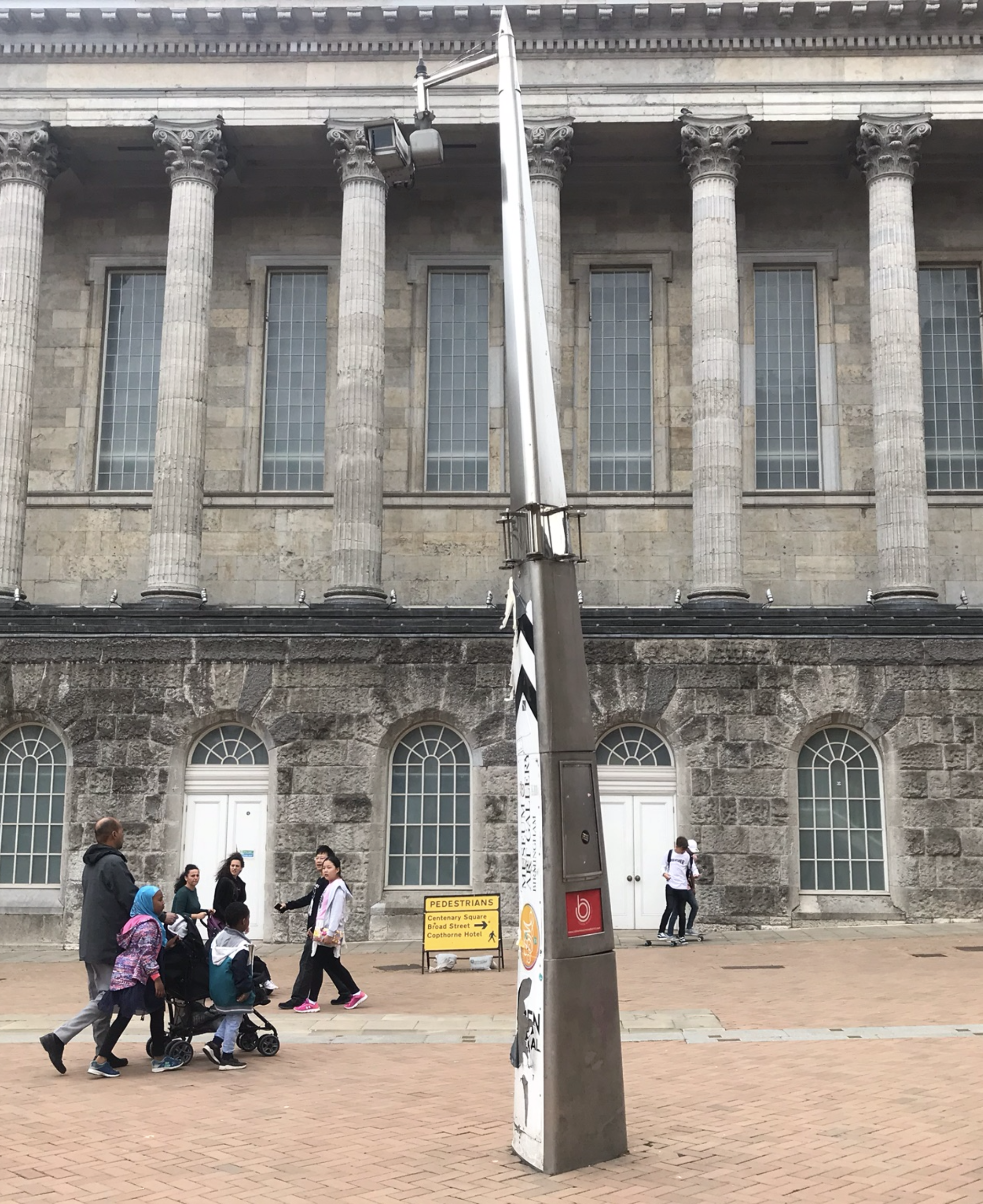 At some point the Museum and Art Gallery have used the signpost as a beacon for their fluctuating entrances, with black and white chevrons pointing the way. It looks to me like this large sticker accidentally covered a sensor or secret camera at the top, below the New Street Station arm, then was covered back up with insulation tape, now hanging off untidily.
