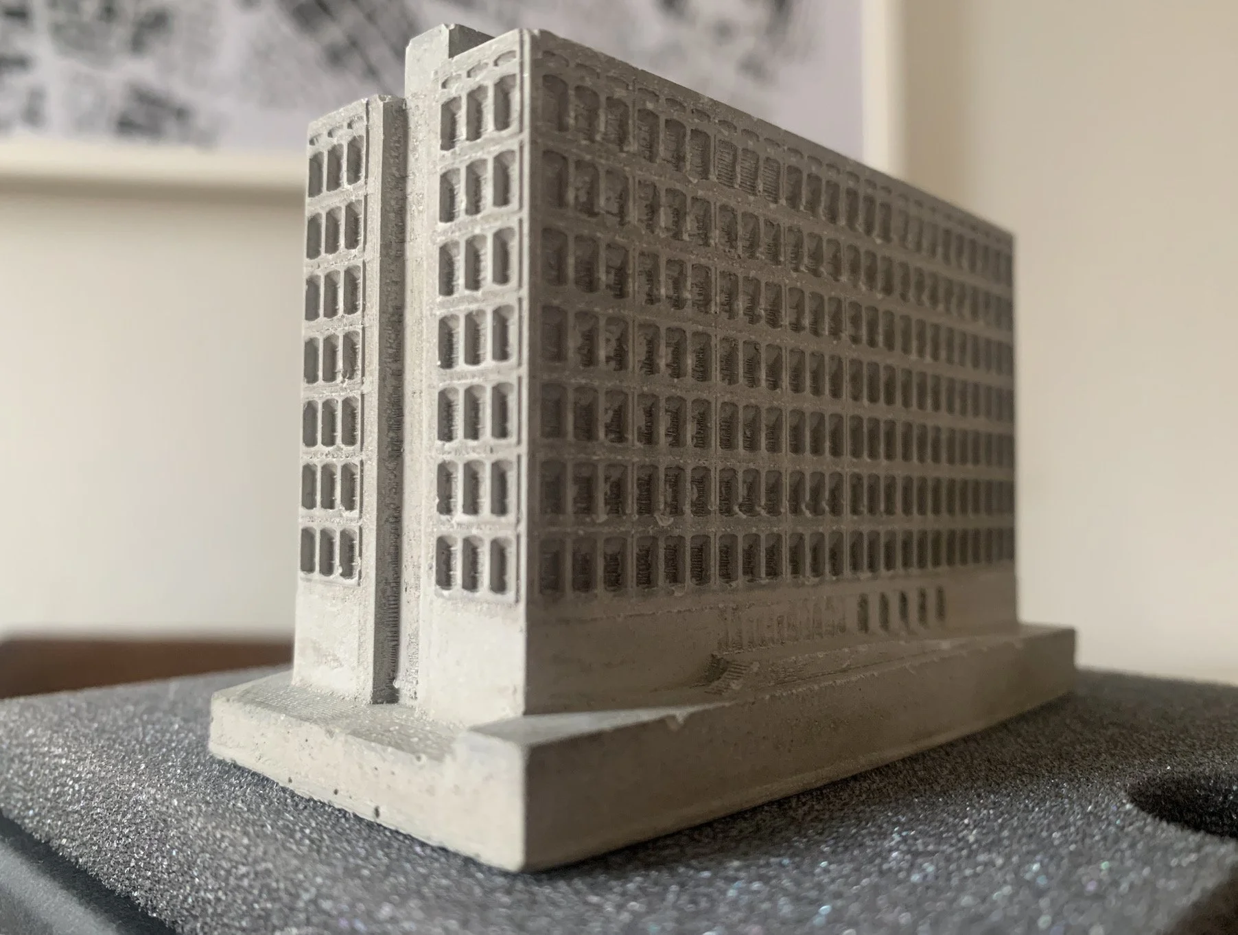 The boxed concrete sculpture made by SpacePlay is a beautiful object and I’m thrilled to own it. As much time and thought has gone into the packaging as making the sculpture. It is housed in an almost Mecca-like mysterious black cube with no external clues to the contents or who made it. A small card shows a detail of the building, including the octagonal windows like the one I escaped from (these are less clear on the small scale of the sculpture itself, so it is nice to have this extra detail in another medium. The block itself is protected by several layers of grey foam. A T Shirt and tote bag accompanied the box when it arrived last week.